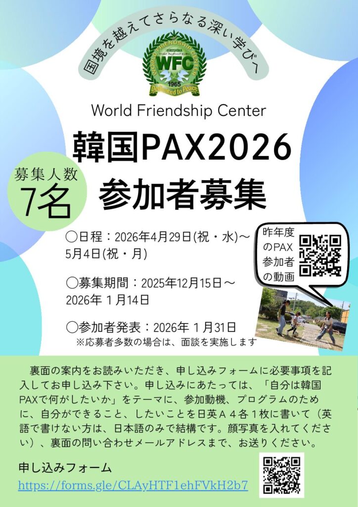 申し込み:案内をお読みいただき、申し込みフォームに必要事項を記入してお申し込み下さい。申し込みにあたっては、「自分は韓国PAXで何がしたいか」をテーマに、参加動機、プログラムのために、自分ができること、したいことを日英A4各1枚に書いて(英語で書けない方は、日本語のみで結構です。顔写真を入れてください)、下記の問い合わせメールアドレスまで、お送りください。