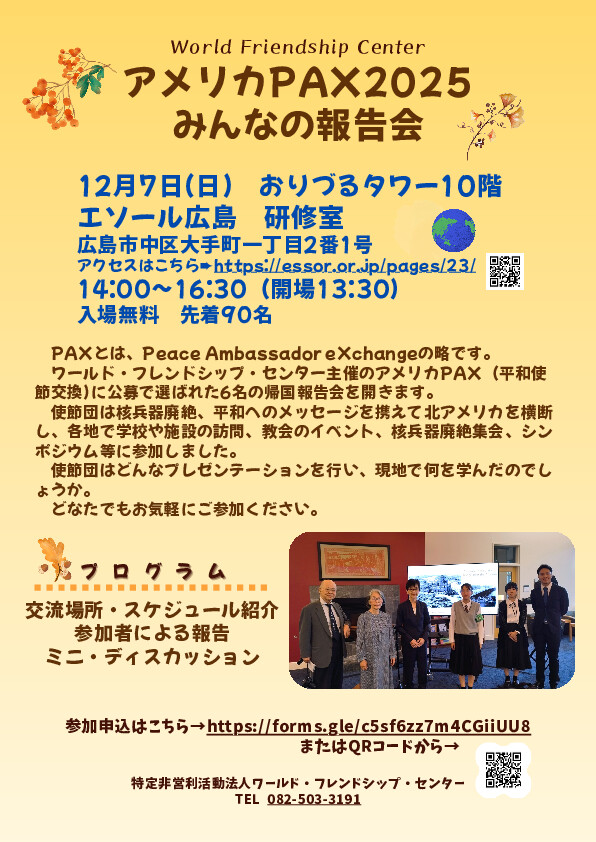 ワールド・フレンドシップ・センター主催のアメリカPAX(平和使節交換)に公募で選ばれた6名の帰国報告会を開きます。