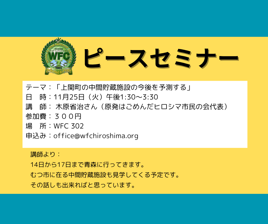 ピースセミナーのお知らせです。 テーマ:「上関町の中間貯蔵施設の今後を予測する」 日 時:11月25日(火曜) 午後1:30~3:30 講 師:木原省治さん(原発はごめんだヒロシマ市民の会代表) 参加費:300円 場 所:WFC302 申し込み:WFC事務所にメールでお申込みください。office@wfchiroshima.org