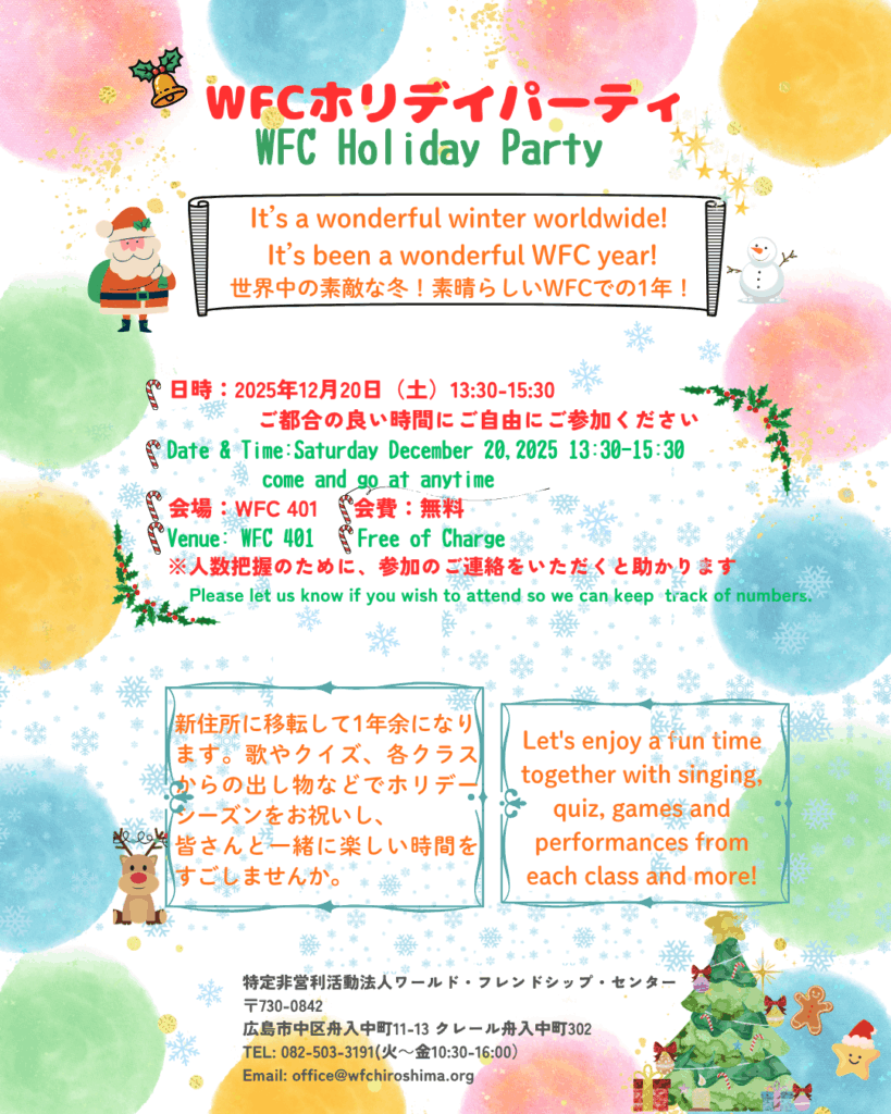 1年の締めくくりとして、また、皆さまへの感謝の気持ちを込めまして、WFCホリデイパーティを以下のとおり開催いたします。