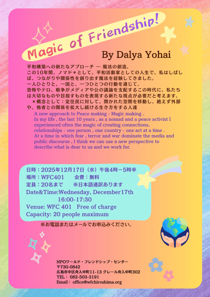 先日来広島に来られている、ダリア・ヨハイさんによります標記プレゼンの会を、次の通り開催することになりましたので、皆さまにご案内申しあげます。